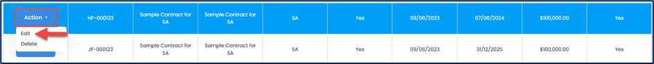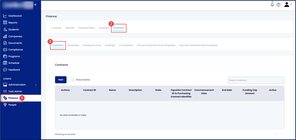 1. From the sidebar menu, go to Finance > Contracts > then Contracts subtab.