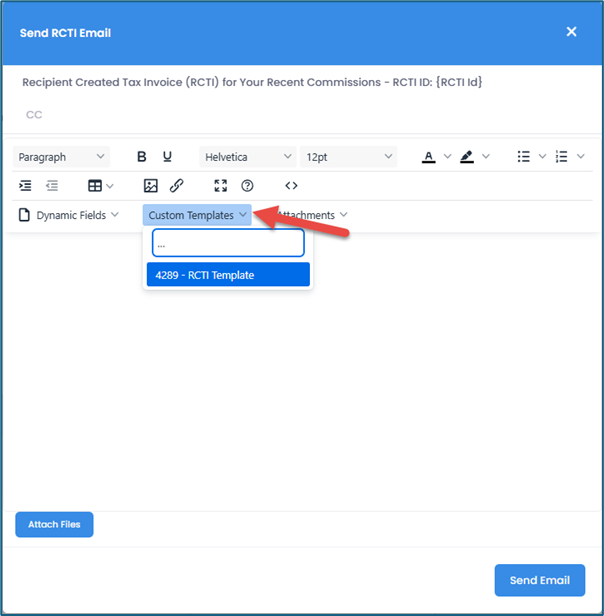 If you have set up an email template for the RCTI Report, you can use it by clicking Custom Templates and selecting the corresponding template.