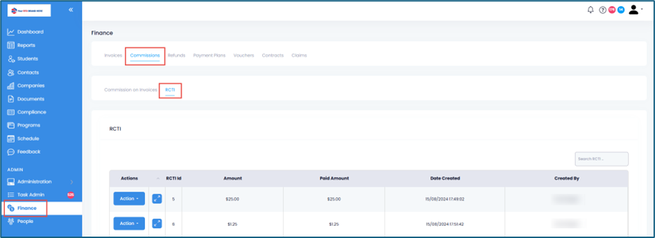 1. On the Finance page, go to Commissions tab then RCTI subtab: