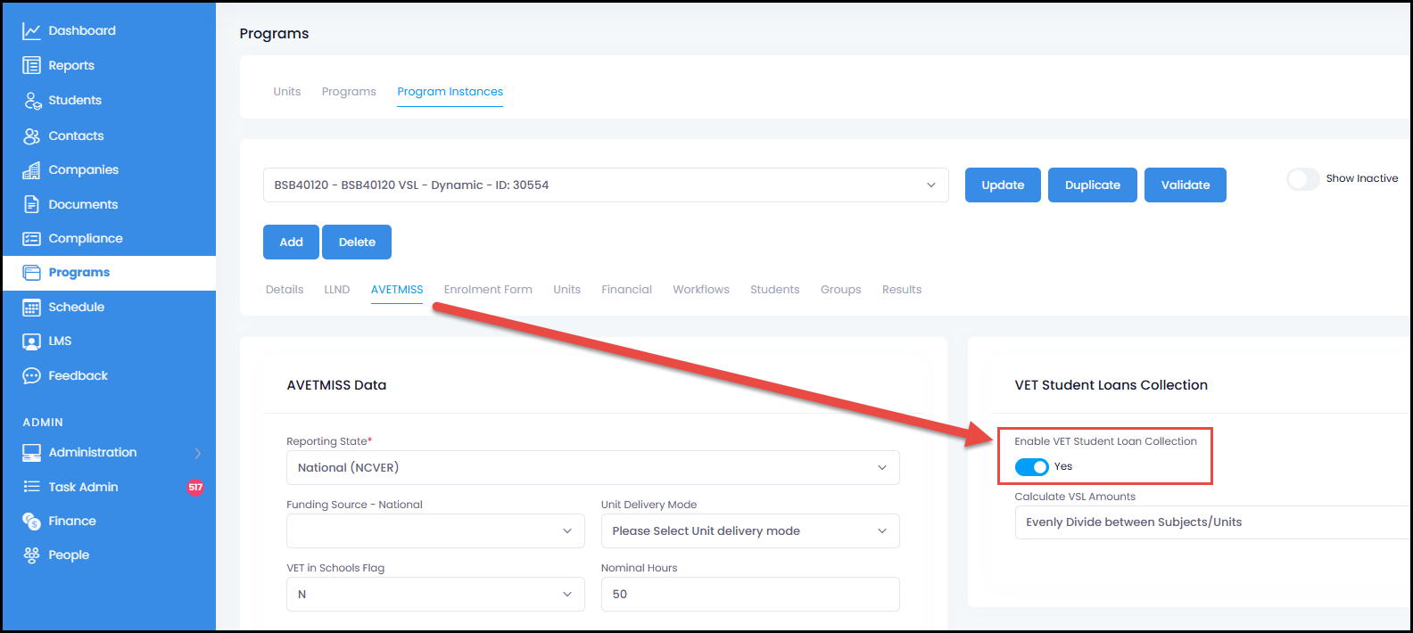 VSL Enrolment toggle appears only if the related Program Instance has Enable VET Student Loans toggled ON in the AVETMISS tab.