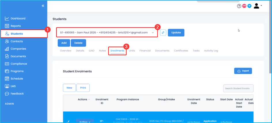 1. Go to the Students tab, locate the student for whom you want to issue a transcript, and then go to their Enrolments.