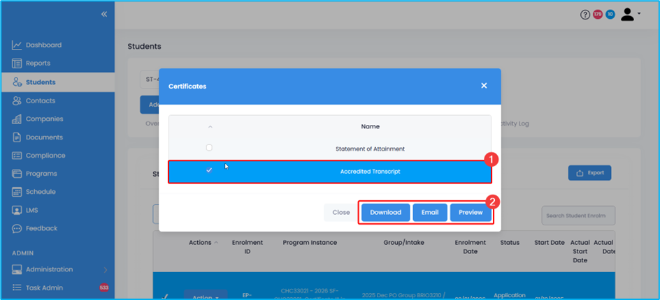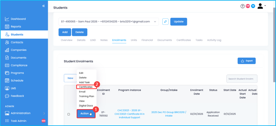 2. Select the specific enrolment for which you wish to issue a transcript. Under the Action button, select Certificates.