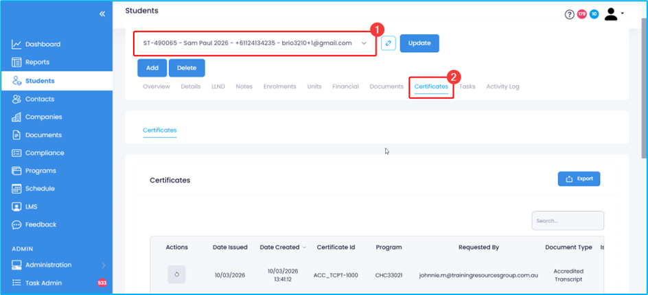 4. The transcript should then be sent to the student. To verify, go to the student’s profile and proceed to the Certificates tab. You should see the issued transcript listed there.