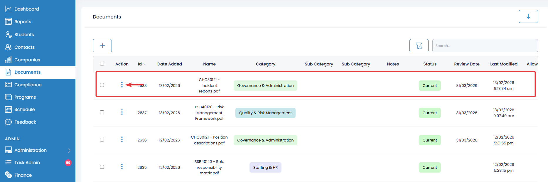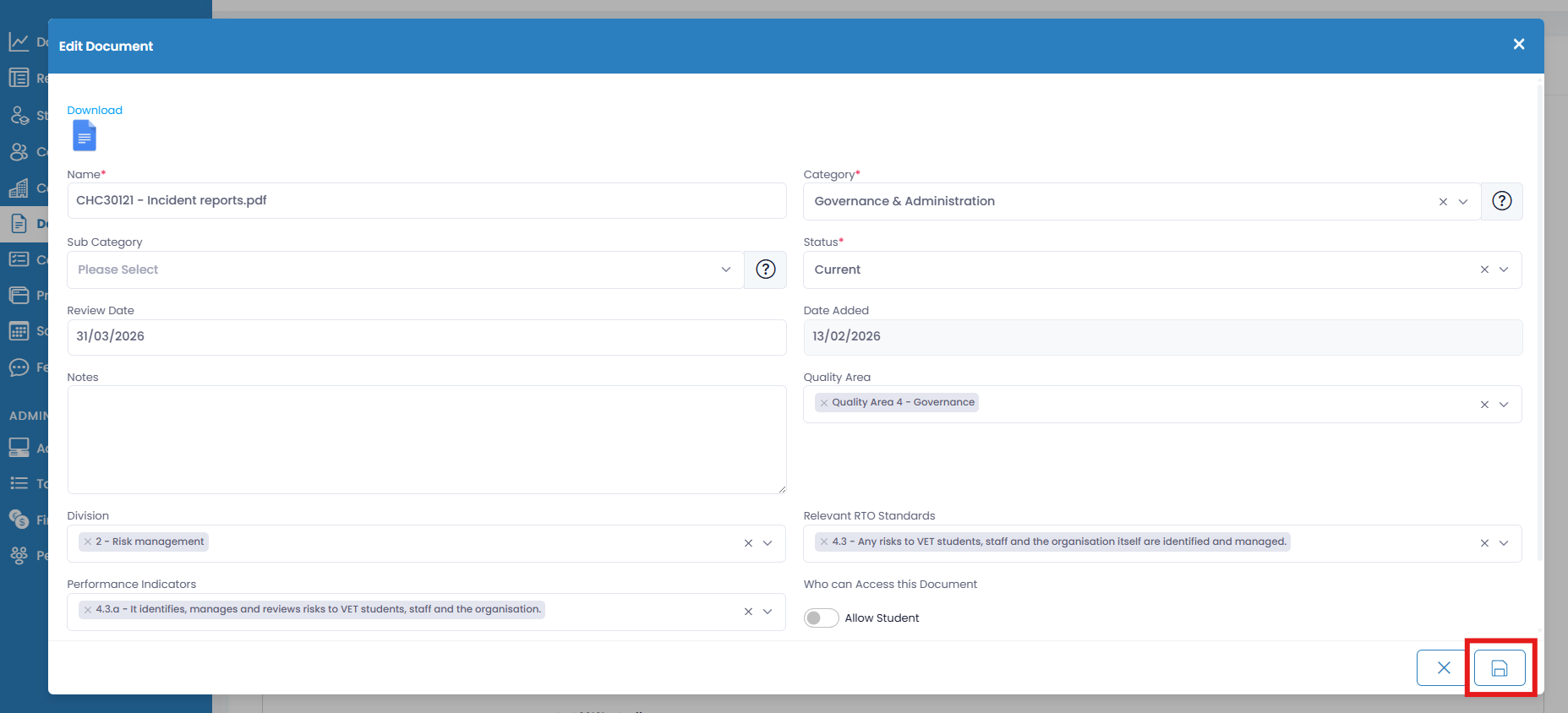 Performance Indicators | (For QMS Documents) not available unless Relevant RTO Standards is chosen. |