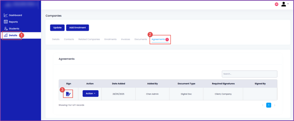 The company contact will need to log in to their Company Portal. Once logged in, navigate to the Details section and then go to Agreements tab.