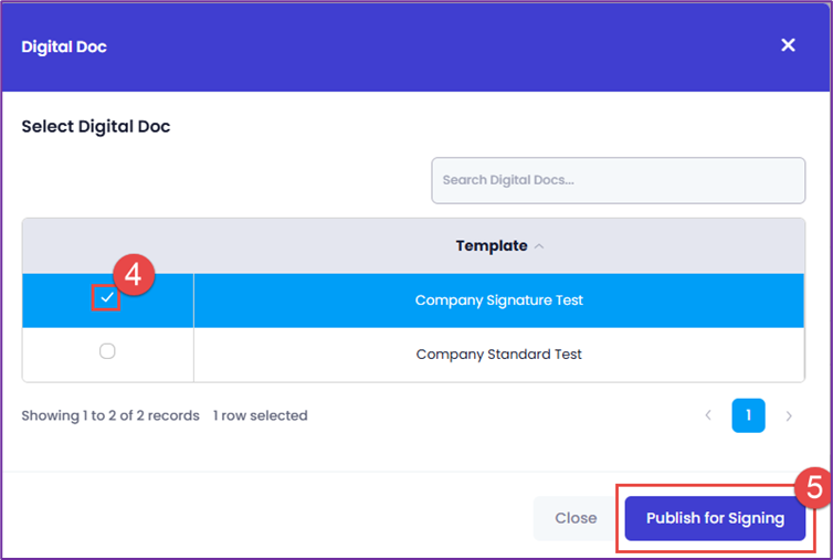 - IF the selected template type is Signature, click on the Publish for Signing button to have this document signed by the company contact.