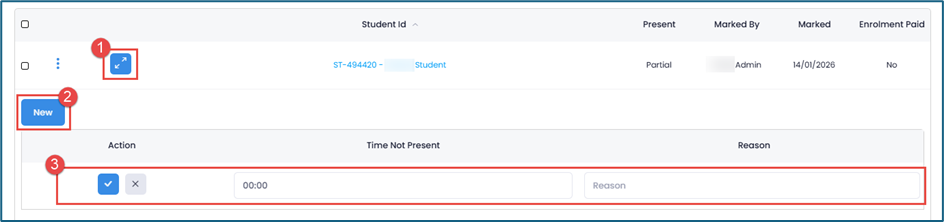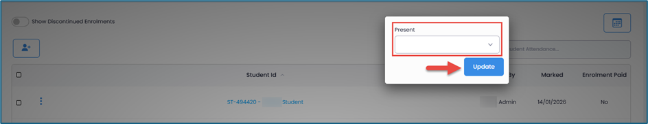 Select Yes if the student is present, No if they are absent, or Partial if they were partially present. Then click Update once done.