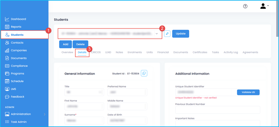 1. From the Dashboard, go to Students, search for and select the student from the drop-down menu, then navigate to the Details tab.
