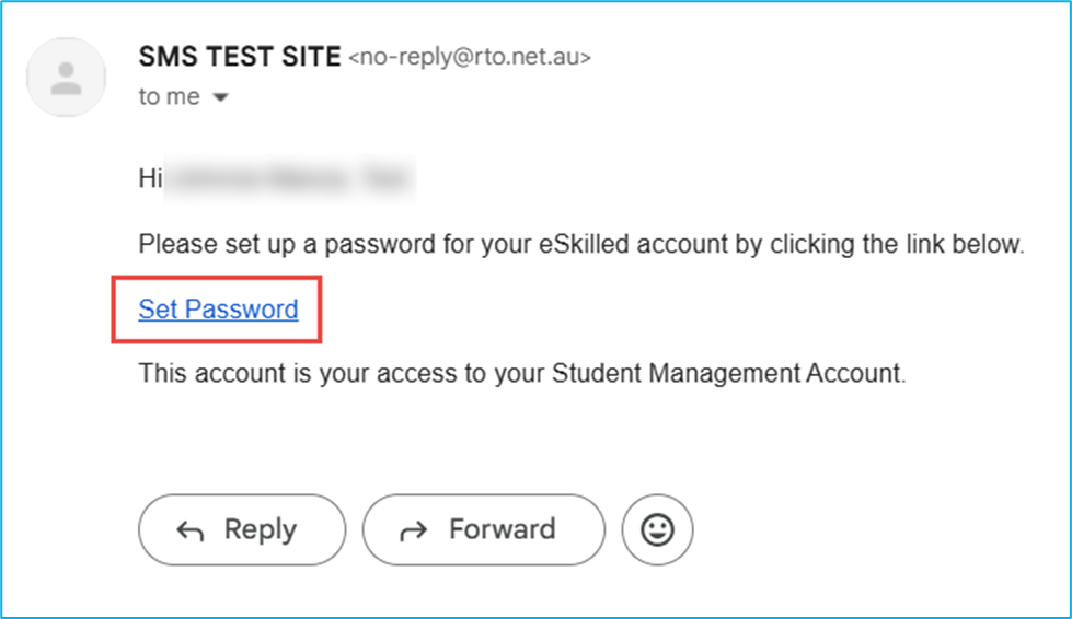 An email containing the Set Password link will be sent to the student’s email address. The link will direct the student to the Reset Password page.