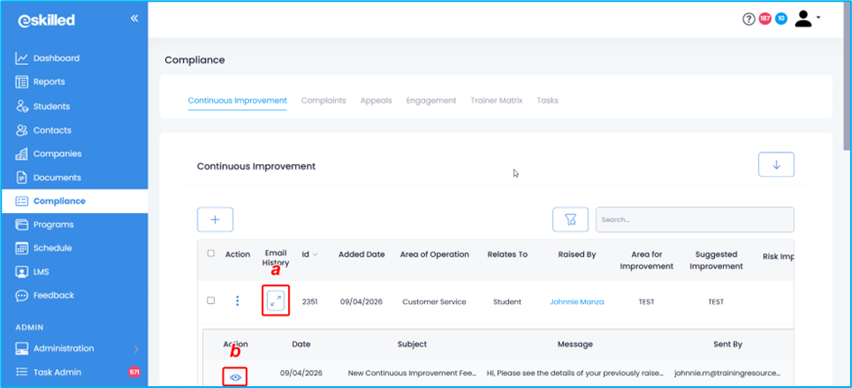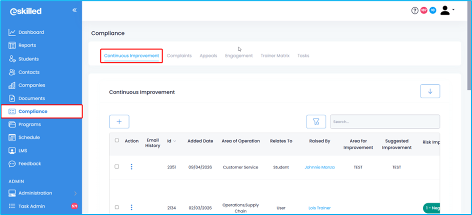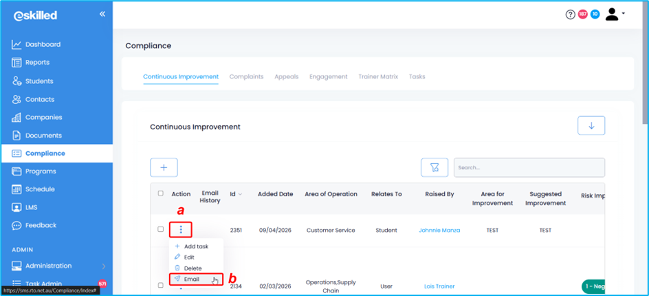 1. From the Dashboard, navigate to the Compliance tab. Depending on where you want to send an email from (Continuous Improvement, Complaints, Appeals, or Trainer Matrix), select the relevant tab. In this example, we’ll use Continuous Improvement.