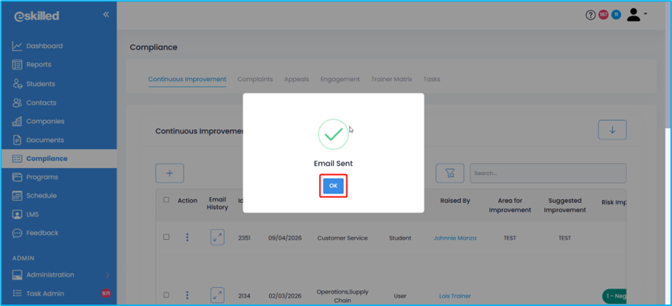 The “Send Email” feature within the Continuous Improvement, Complaints, Appeals, and Trainer Matrix sections of the Compliance module provides a centralised and traceable way to manage communication directly from each compliance record. It enables users to send targeted emails without leaving the record, ensuring that all correspondence is linked to the relevant case. Every email sent is automatically logged in the system, capturing key details such as the sender, recipient, date, and time, which supports full auditability and communication history tracking. This improves transparency, ensures accountability, and provides users with complete visibility of all interactions related to each compliance item.