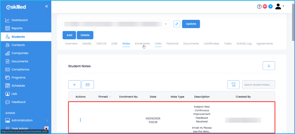 NOTE: For emails sent to students from Continuous Improvement, Complaints, and Appeals, a record is created in the Students page > Notes section.