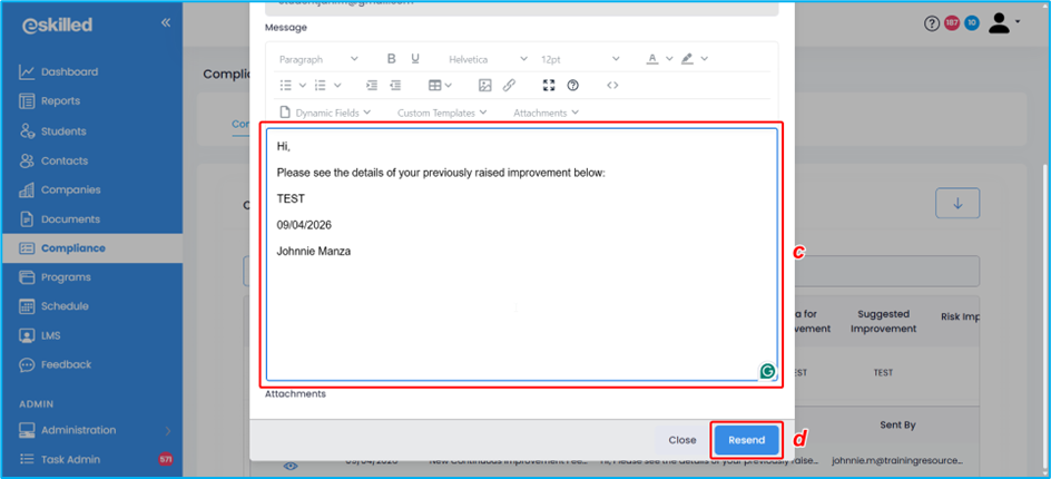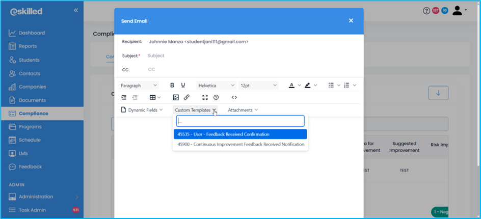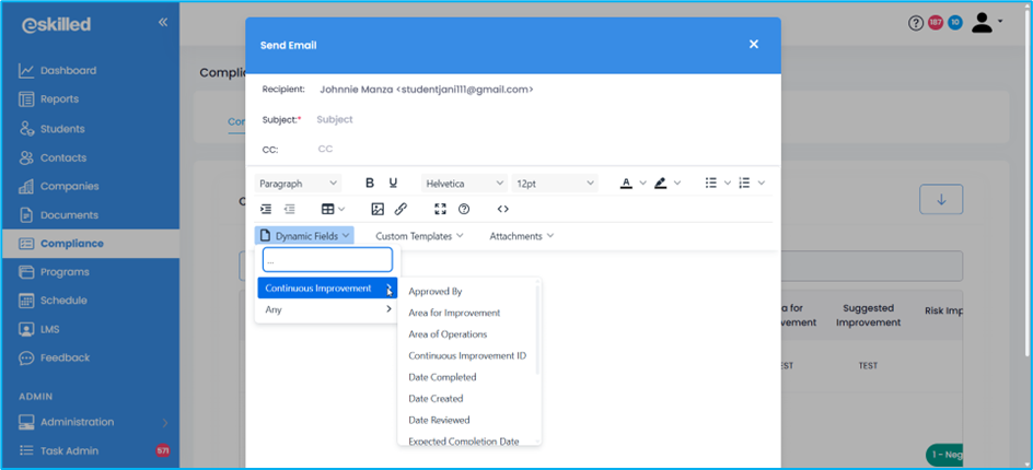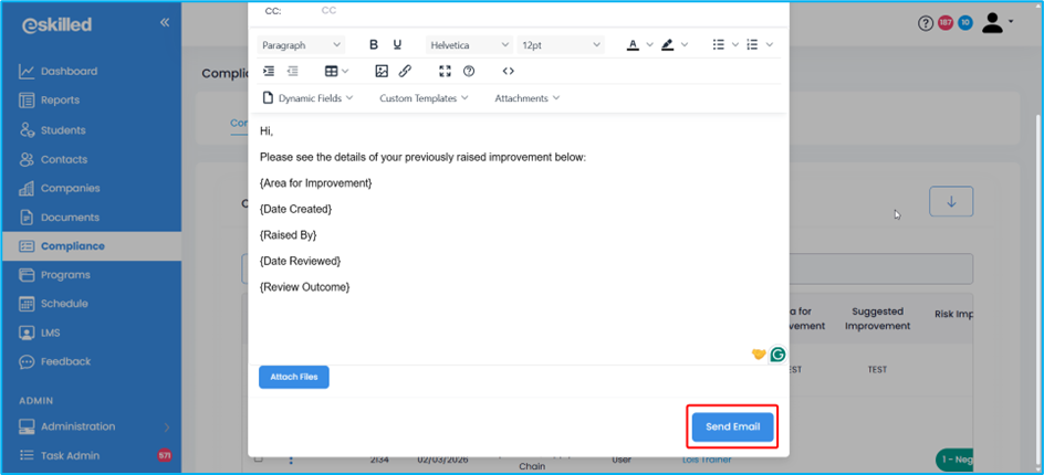 3. An Email Modal opens, which can be fully configured. It also automatically filters SMS Tags and Email Templates based on the selected Compliance tab (e.g., Continuous Improvement, Complaints, Appeals, or Trainer Matrix). This ensures users only see the most relevant tags and templates for their current context.