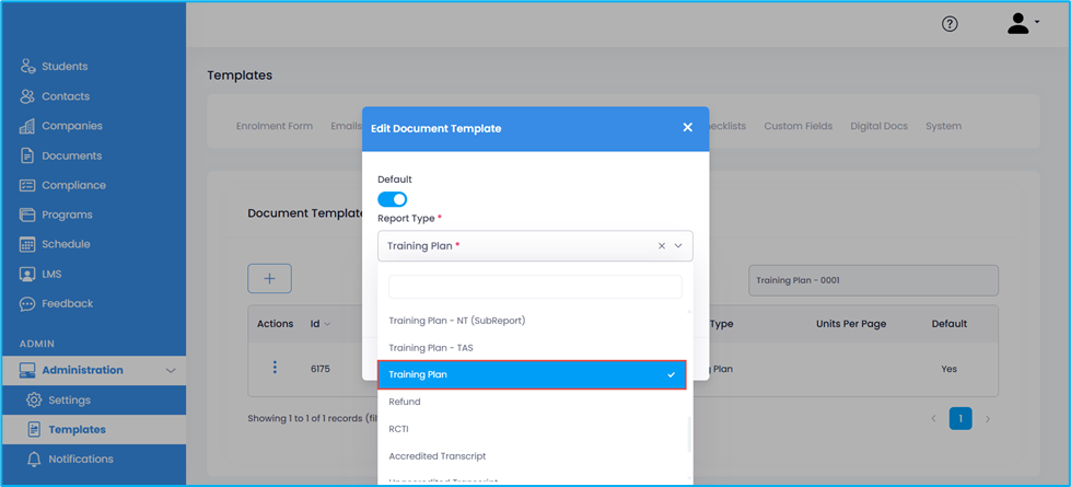 1. Go to Administration > Templates > Documents . A new report type called Training Plan will be available. This allows the RTO to create or manage custom Training Plan templates.