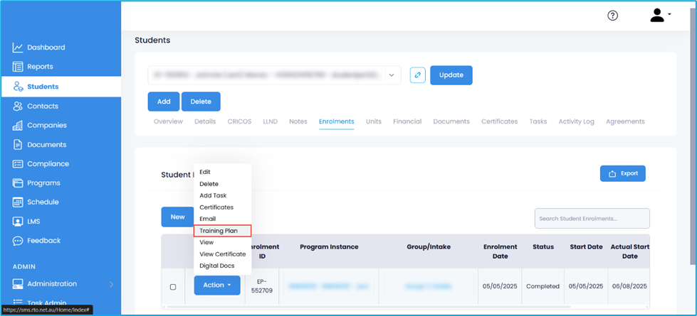 3. When an enrolment belongs to a Program Instance that has a Training Plan set, go to Students > Enrolments and open the Action dropdown, where a Training Plan option will be available for selection, allowing the user to access or generate the assigned Training Plan for the student.