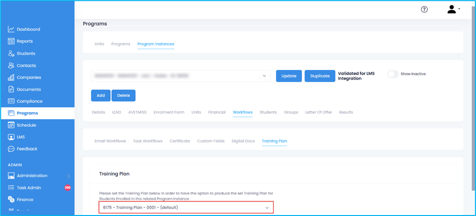 2. In Programs > Program Instances > Workflows, a new tab labelled Training Plan will appear, containing a dropdown menu that displays all Document Templates with their Report Type set to Training Plan, with only templates associated with the logged-in RTO being shown.