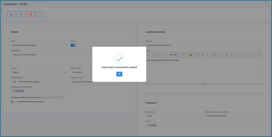 3. A prompt about the successful creation of the automation will appear. Click OK to close it.