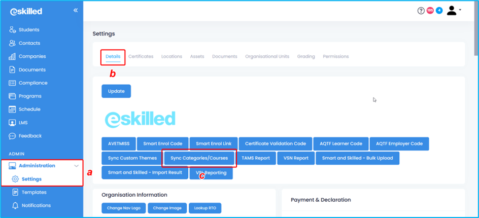 1. From the Dashboard, go to Administration, then Settings, then Details. Look for the Sync Categories/Courses button, then click it.