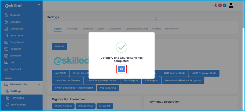 2. Wait a few seconds until the system confirms that the sync is complete. A confirmation modal will appear; click OK to close it. LMS courses and categories should now be reflected in the SMS.