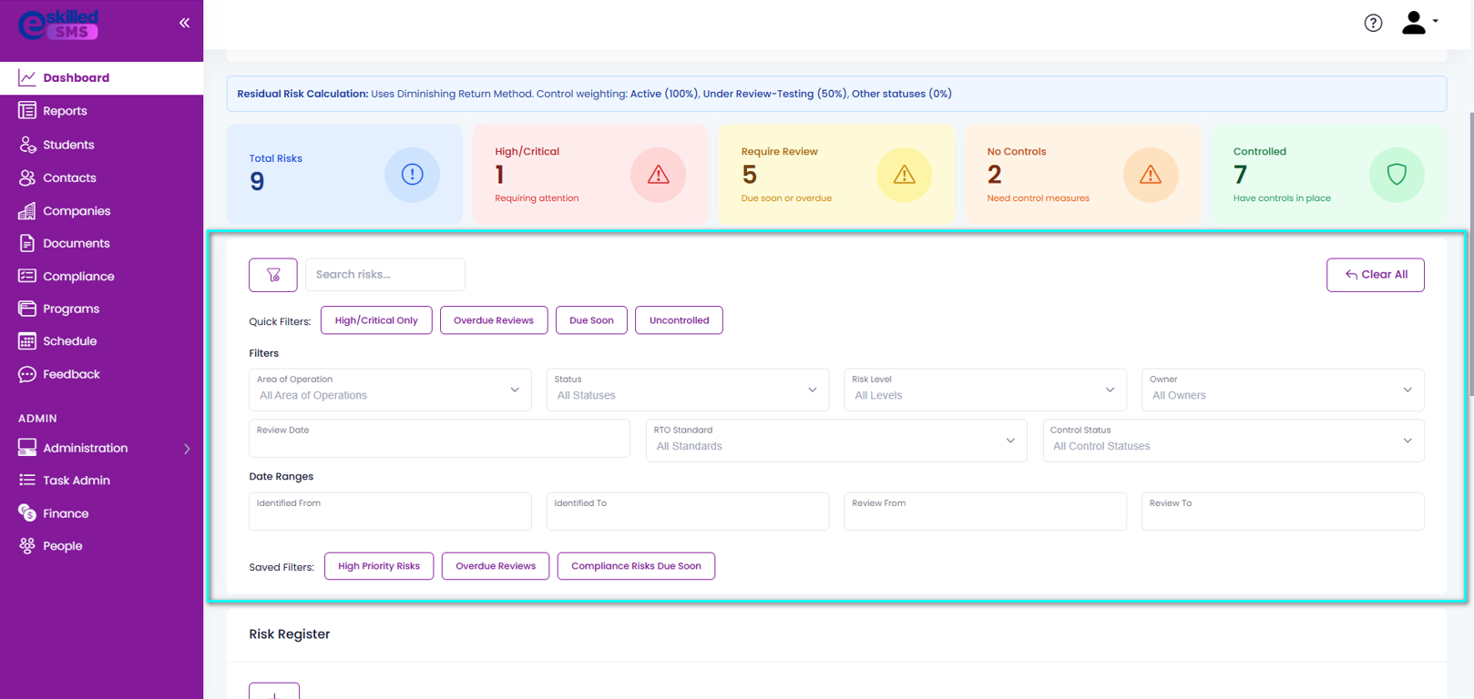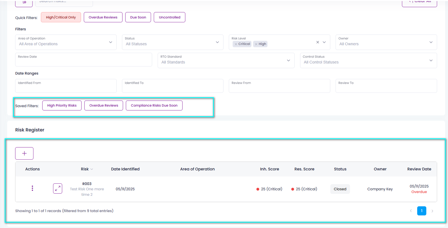 | Risks requiring Review | Risks that are due for review within 30 days or are overdue |