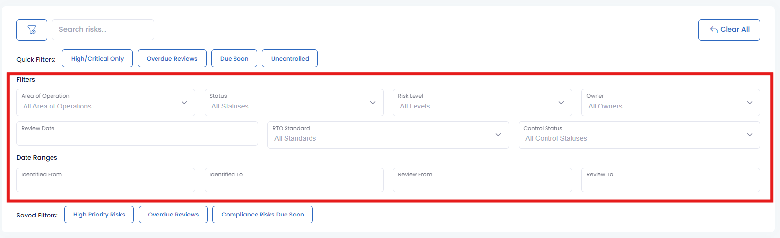 | Text Fields | This is used for searching. It contains the label “Search Risks” |