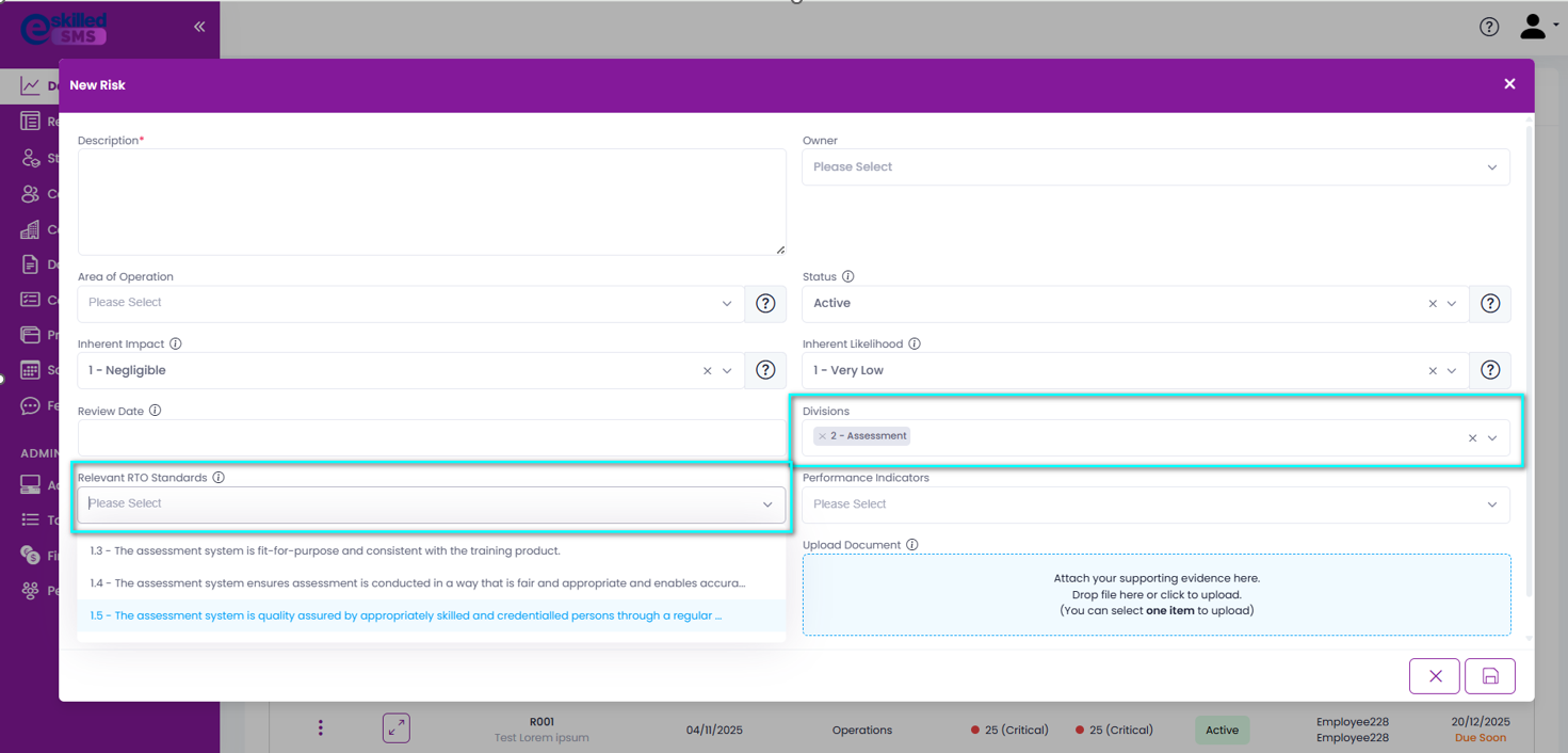 Upload Document | This part of the feature provides a way to attach relevant supporting documents for the risk to be added (policies, procedures, reports, etc.) |