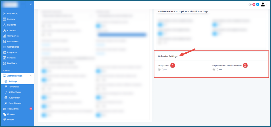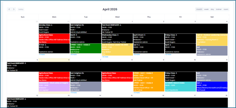 - Display Detailed Event in Scheduler – Allows you to display more detailed event information directly within scheduled events. When enabled, events will display additional information such as the event title (in bold), start and end time, location ID, room name (if assigned), trainer(s), and enrolled/max students.