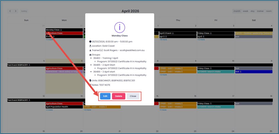 - View - When the entry is clicked, this will display information on the event, such as Date and time of event, Location. Trainer assigned, Related Group, Units and Notes.