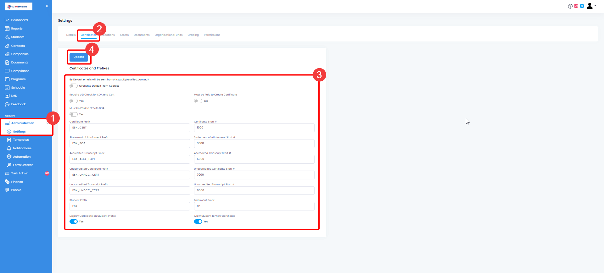 In this tutorial, we will show how you can configure the Certificate settings in the SMS. Setting up your certificates correctly is crucial to ensuring an efficient management of your student completions and increases your student's over all experience and satisfaction while ensuring your compliance to certificate issuance policies. Properly configured certificate settings in your student management system ensure that certificates are generated accurately and in line with the completion criteria set by your organisation. This helps maintain precise records of student achievements and ensures that certificates are awarded only to those who meet the specified requirements. For the purpose of verification and authenticity as well as compliance, a properly configured settings ensures validity of certificates and adherence to regulatory laws.